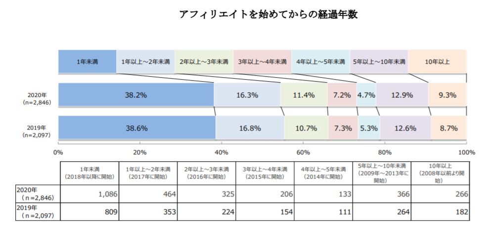【参考】「アフィリエイトを始めてからの経過年数」データを載せておきます。3年以上続けている人は半分にも満たないのがわかります。半分の方が2年以内に収まっているのが現実を物語っていますね。