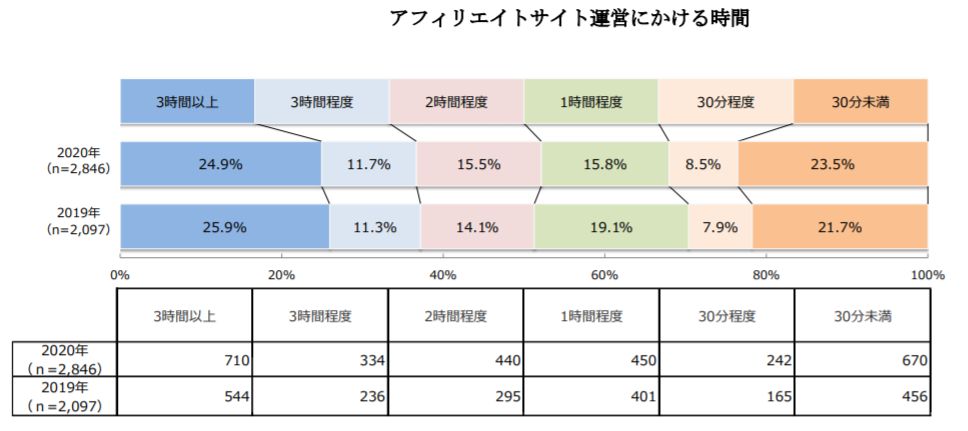 『アフィリエイト・プログラムに関する意識調査2019』を見ると、稼ぎが小額の人ほどアフィリエイトに投入する時間が少なく、逆に100万円以上稼ぐ人はその8割超が、3時間以上もアフィリエイト活動に投入していることが分かります。