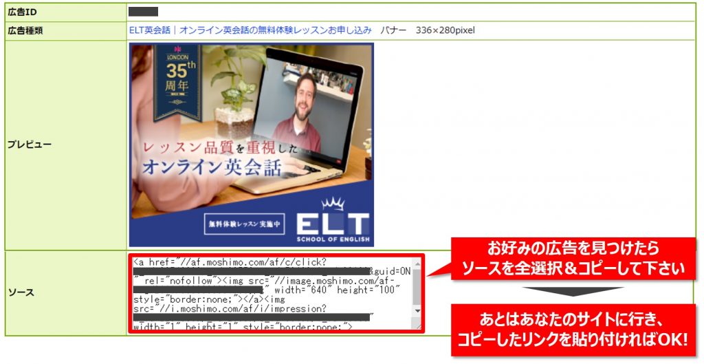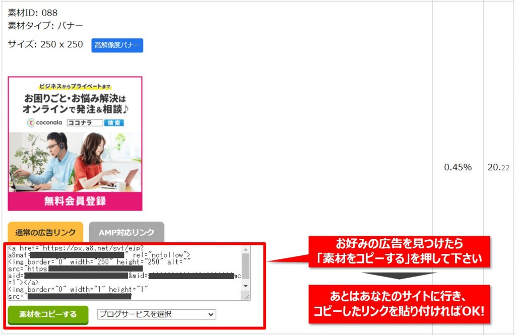 【Step3】たくさんの広告がリスト表示されますので、中から好みの広告を見つけてください。あわせて表示されている広告リンクをコピーして、あとはあなたのサイトに行き、コピーしたリンクを貼り付ければOKです!