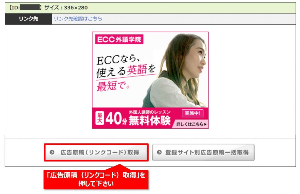 【Step3】たくさんの広告がリスト表示されますので、中から好みの広告を見つけてください。見つけたら「広告原稿(リンクコード)取得」を押して下さい。