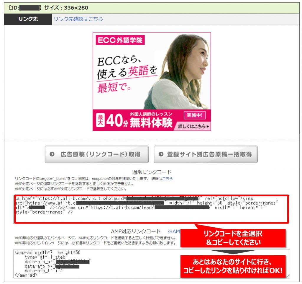 【Step4】広告リンクが表示されますので、全選択の上コピーしてください。あとはあなたのサイトに行き、コピーしたリンクを貼り付ければOKです!