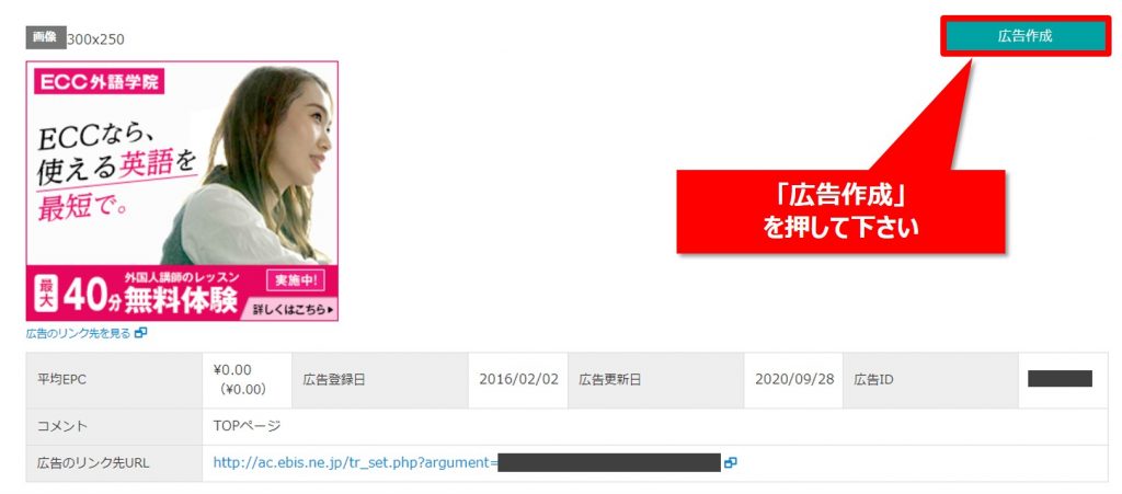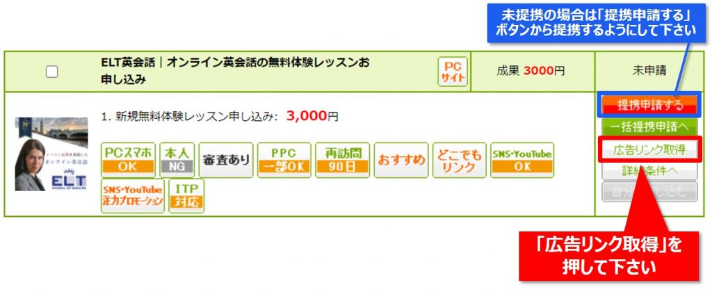 【Step2】表示されたリストの中にお目当てのものを見つけたら「広告リンク取得」を押して下さい。