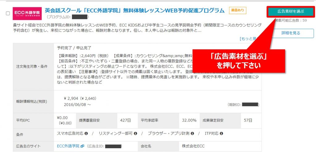 #バリューコマースには「ココナラ」の提携広告がありません。ここではアフィリエイトで人気の高い「英会話」で検索した場合の画像で解説します。ご参考まで。