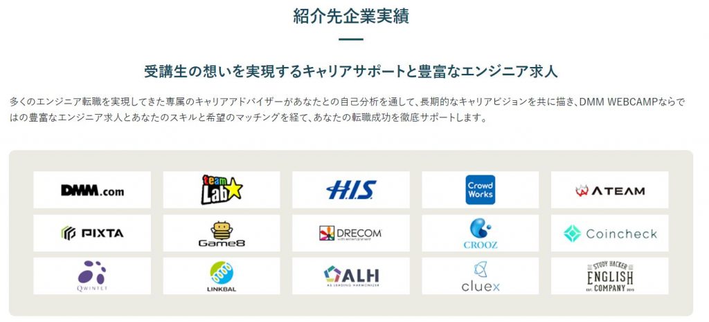 紹介先企業はDMM.com、HIS、クラウドワークスなど様々。DMM.comは”なるほど”と言う感じがしますが、逆にDMM.comで働きたければ、DMM Web Campから入るのが近道かもしれませんね。