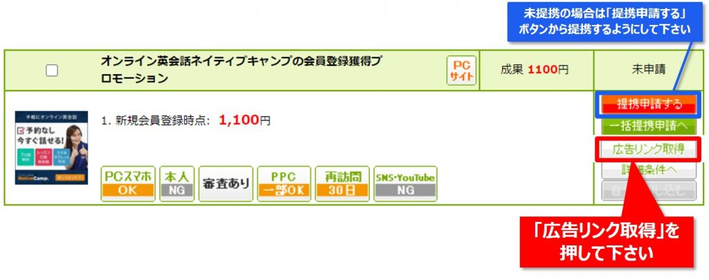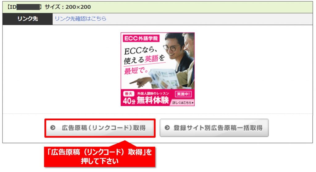 【Step2】表示されたリストの中にお目当てのものを見つけたら「広告リンク取得」を押して下さい。
