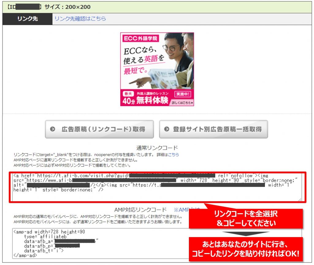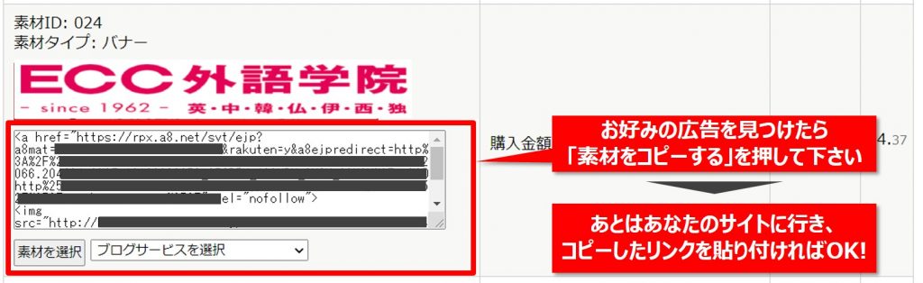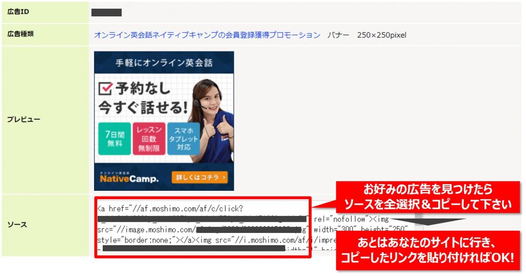 【Step3】たくさんの広告がリスト表示されますので、中から好みの広告を見つけてください。あわせて表示されている広告リンクをコピーして、あとはあなたのサイトに行き、コピーしたリンクを貼り付ければOKです!