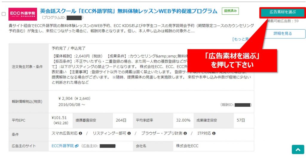 #もしもアフィリエイトには「ECC外語学院」の提携広告がありません。ここでは別の英会話プログラムで人気の高い「ネイティブキャンプ」で検索した場合の画像で解説しますのでご参考まで。