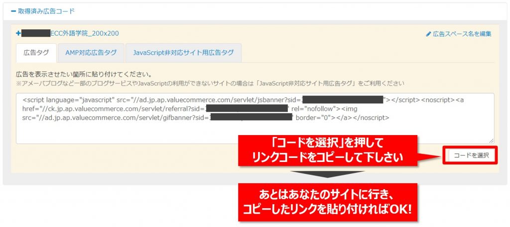【Step4】リンクコードが表示されますので「コードを選択」を押してコピーしてください。あとはあなたのサイトに行き、コピーしたリンクを貼り付ければOKです!