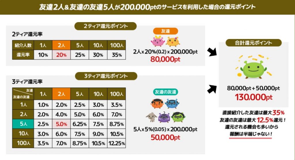 友達紹介制度 1件あたり800pt、2ティアで10~35%、3ディアでも1~12.25%