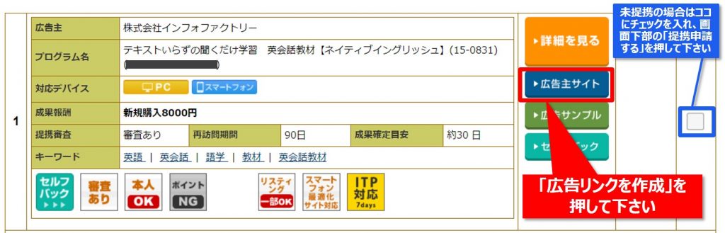 【Step2】表示されたリストの中にネイティブイングリッシュのものを見つけたら「広告リンク取得」を押して下さい。