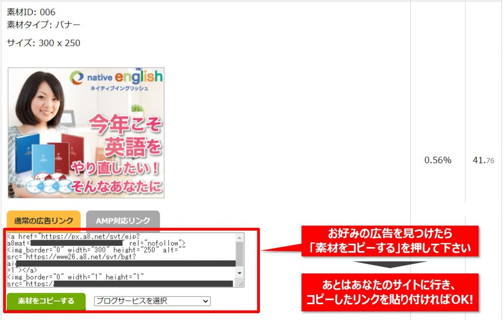 【Step3】たくさんの広告がリスト表示されますので、中から好みの広告を見つけてください。あわせて表示されている広告リンクをコピーして、あとはあなたのサイトに行き、コピーしたリンクを貼り付ければOKです!
