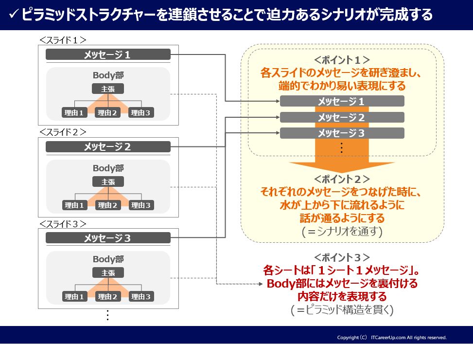 この「メッセージ」「シナリオ」「ピラミッド構造」が貫かれた状態が、シナリオ構築で⽬指すべき状態です。