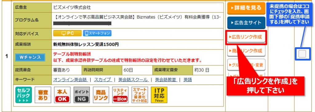 #もしもアフィリエイトには「スタディサプリ」の提携広告がありません。ここでは別の英会話プログラムで人気の高い「ネイティブキャンプ」で検索した場合の画像で解説しますのでご参考まで。