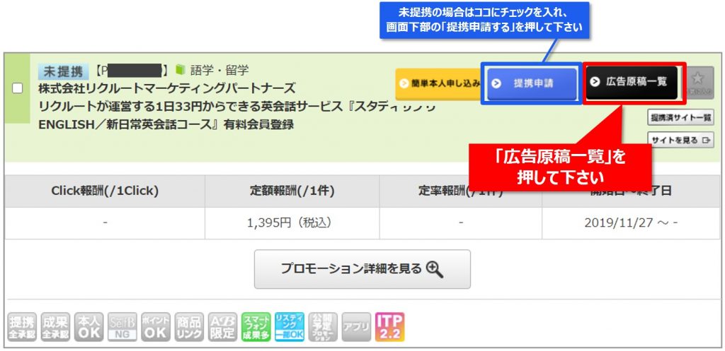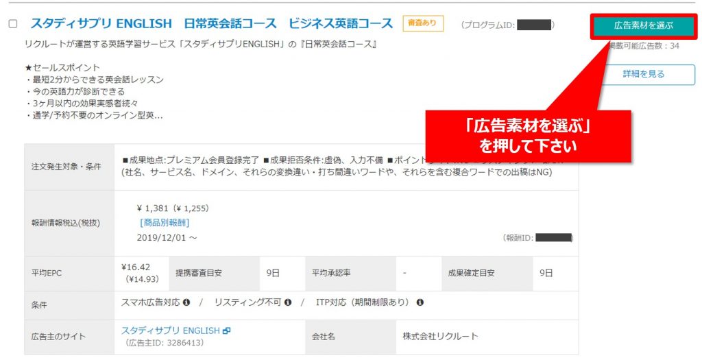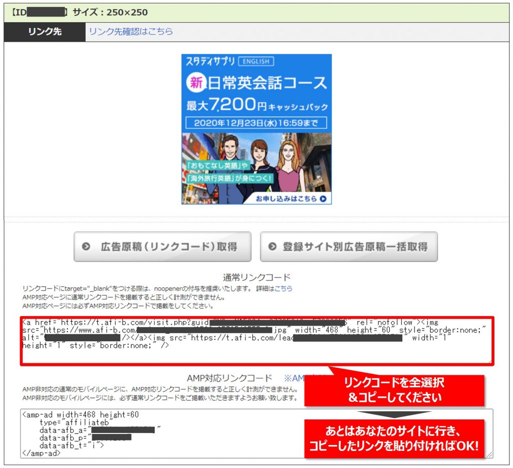 【Step3】たくさんの広告がリスト表示されますので、中から好みの広告を見つけてください。あわせて表示されている広告リンクをコピーして、あとはあなたのサイトに行き、コピーしたリンクを貼り付ければOKです!
