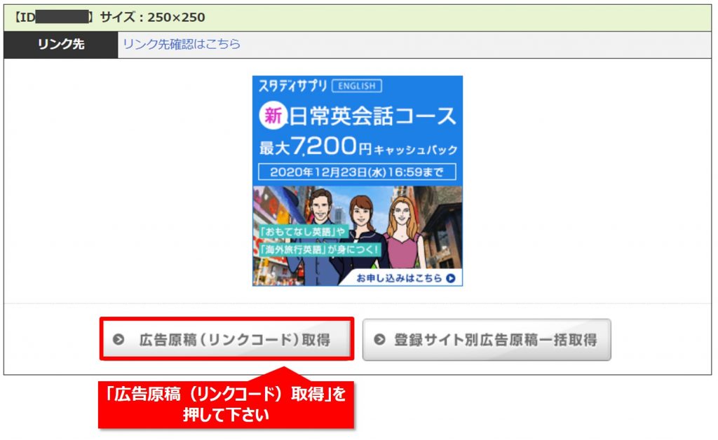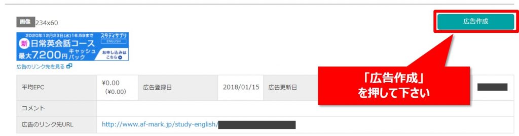 【Step2】表示されたリストの中にお目当てのものを見つけたら「広告リンク取得」を押して下さい。