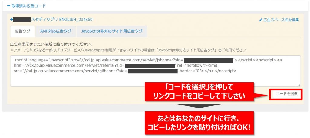 【Step4】リンクコードが表示されますので「コードを選択」を押してコピーしてください。あとはあなたのサイトに行き、コピーしたリンクを貼り付ければOKです!