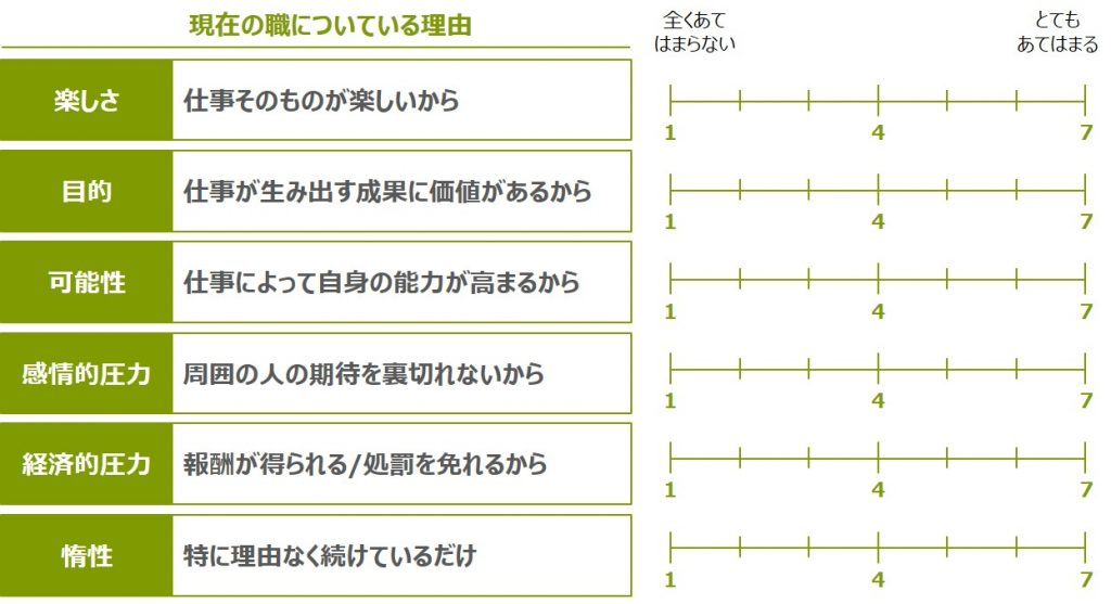 まず下図のように、あなたが今の仕事についている動機をスコアリングしてください。