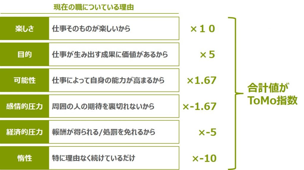 それぞれの動機は重みづけされていて、それらを合算するとToMo指数がはじき出されます。