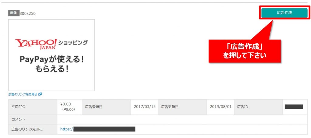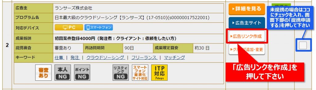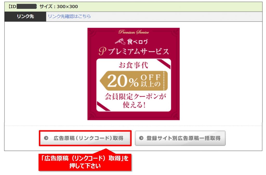 【Step2】表示されたリストの中にお目当てのものを見つけたら「広告リンク取得」を押して下さい。