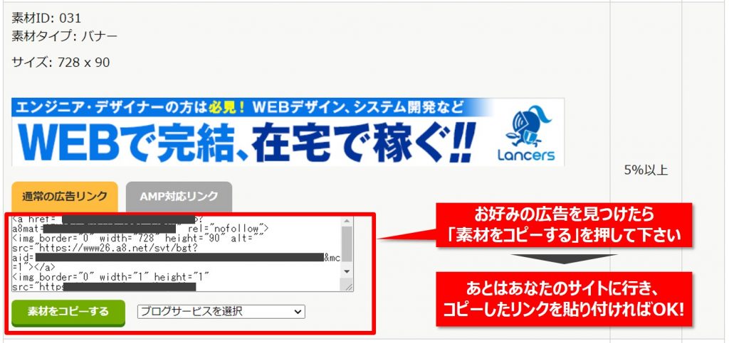 【Step3】たくさんの広告がリスト表示されますので、中から好みの広告を見つけてください。あわせて表示されている広告リンクをコピーして、あとはあなたのサイトに行き、コピーしたリンクを貼り付ければOKです!