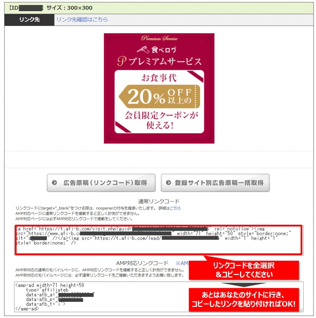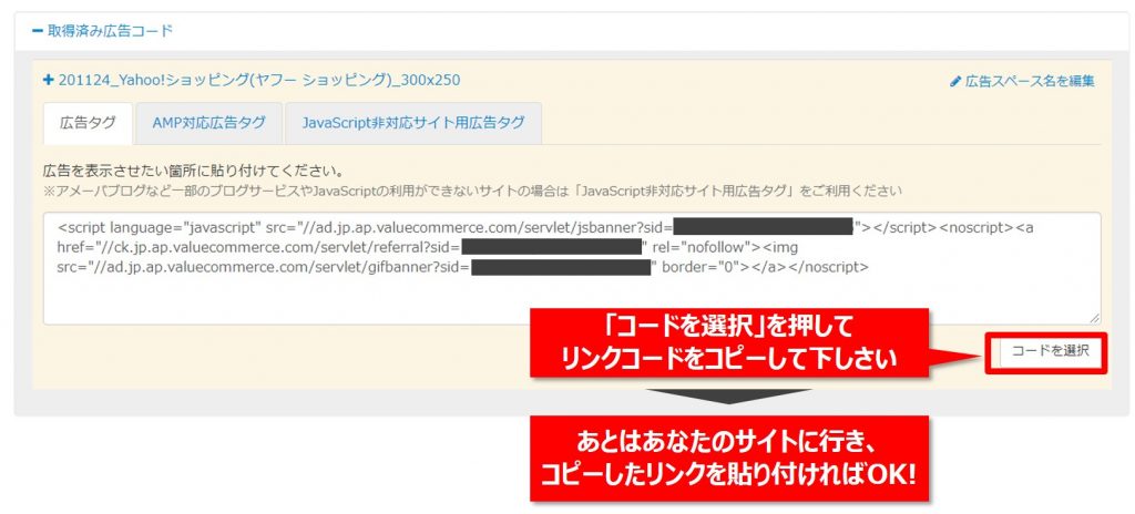 【Step4】リンクコードが表示されますので「コードを選択」を押してコピーしてください。あとはあなたのサイトに行き、コピーしたリンクを貼り付ければOKです!