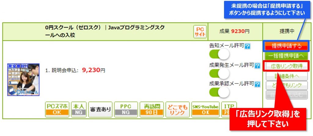 【Step2】表示されたリストの中に「0円スクール」を見つけたら「広告リンク取得」を押して下さい。