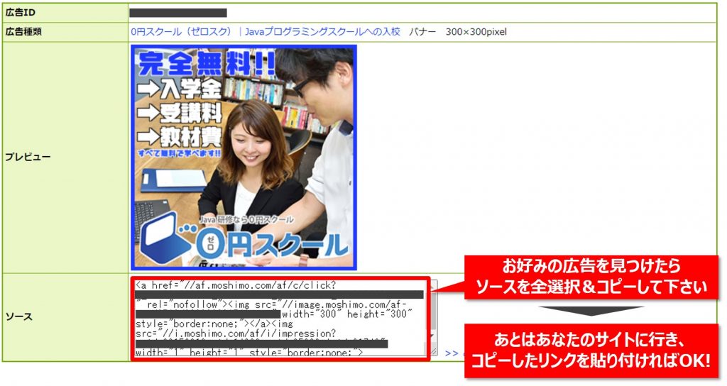 【Step3】たくさんの広告がリスト表示されますので、中から好みの広告を見つけてください。あわせて表示されている広告リンクをコピーして、あとはあなたのサイトに行き、コピーしたリンクを貼り付ければOKです!